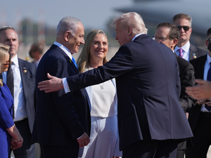 Israeli President Isaac Herzog and Prime Minister Benjamin Netanyahu greeted Trump on the tarmac as a military band played. In Hostages Square in Tel Aviv, the site of continuous demonstrations during two years of war, the crowd cheered for Trump.