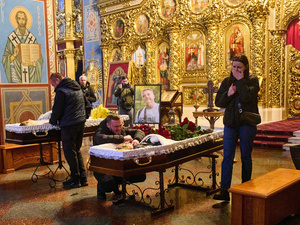 About 100 people gathered at a church in Kyiv on Monday to honor two Ukrainian journalists killed when a Russian drone struck their car in eastern Ukraine's Donetsk region.